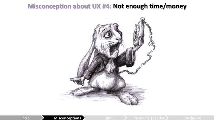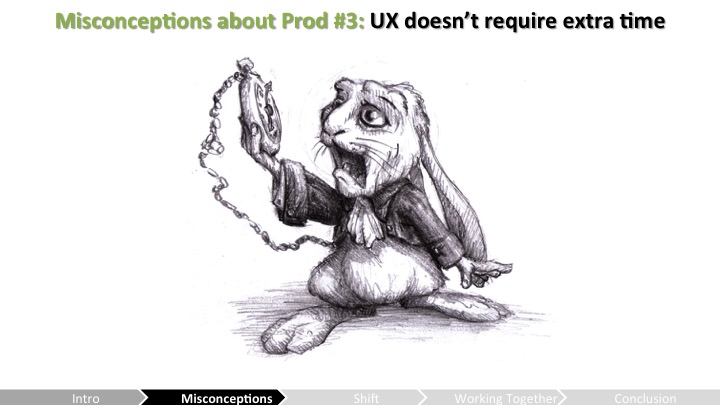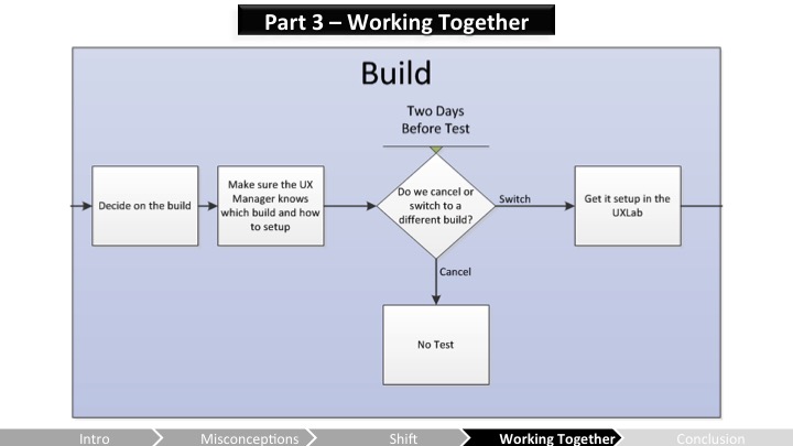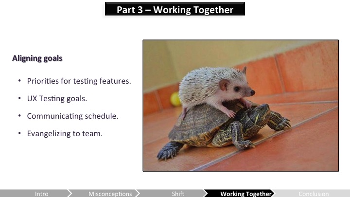 Heather – 결국 좋은 UX 프로세스가 개발팀의 시간을 절약해준다는건 인정해. 하지만 초기에, 프로세스에 UX가 붙ㅇ는건 더 많은 시간을 요구하잖아. 너 테스트에 할당해야만 하고, 피드백을 리뷰잉하면서 추적도 해야하고, UX 프랙티스를 팀에 교육하고, 기타 등등 말야. 그건 일정에 통합될 필요가 있고, 그게 안되면 그건 무시될거야. UX를 개발 프로세스에 통합시키는 것은 밤을 샌다고 되는 일이 아니고, 그저 신발끈을 묶는 프로세스라는걸 알아둬야 해. 너는 팀을 준비시키고, 지원받고, 그걸 점진적으로 소개할 수 있는 방법들을 찾아내야 해. 그저 테스트를 하고 리포트를 작성하는건 사실 실제론 UX를 우리 프로세스로 통합시키는게 아니야.