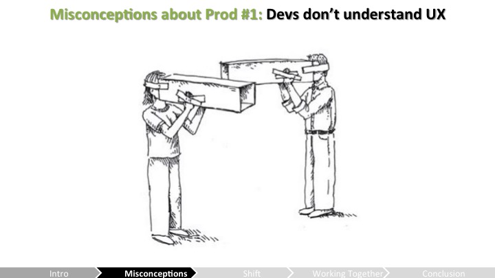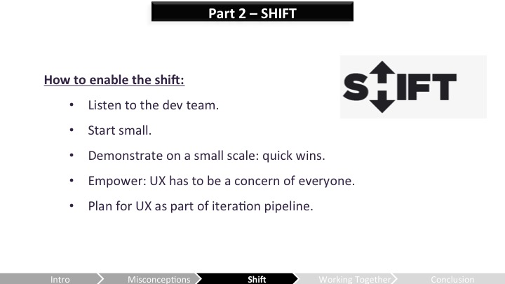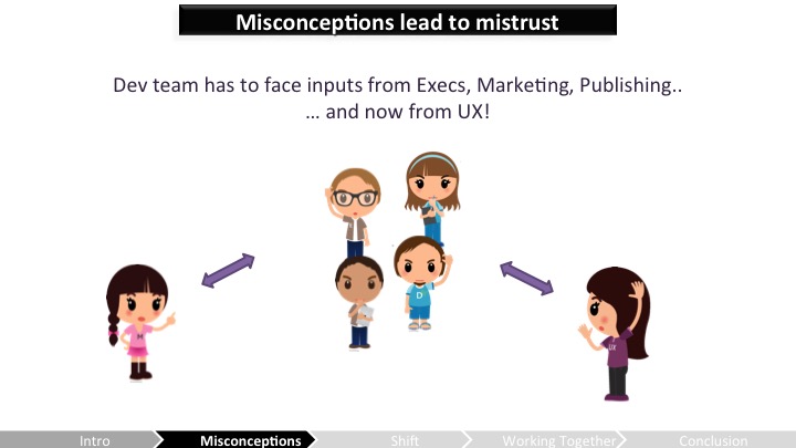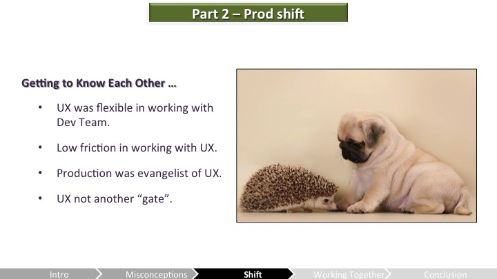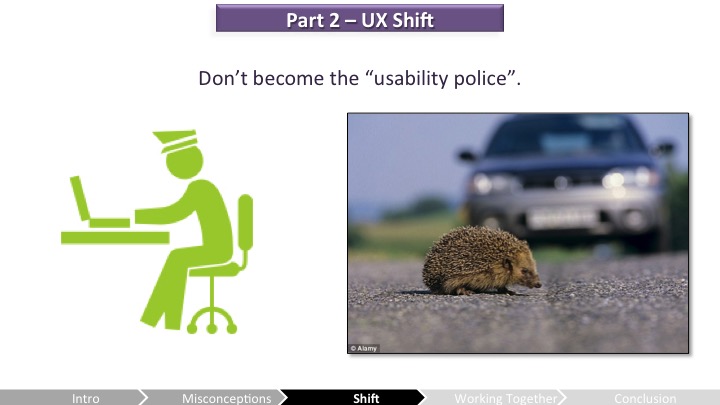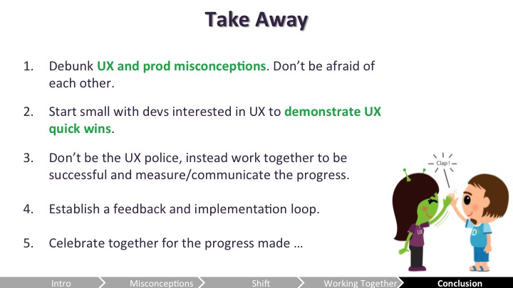 Celia – 음, 네가 먼저 이러한 오해들을 극복한걸 얘기했으니 "우리"가 새로운 파트너인 외계인으로서 UX 사람들이 뗐던 첫 발자국에 대해 논해보려고 해. 나는 사용성 가이드라인과 관련된 팀을 맡는걸 그만둬야했고 개발중에 일어나는 명백한 UX 규칙 위반마다 매번 성가시게 하는걸 그만둬야 했어.