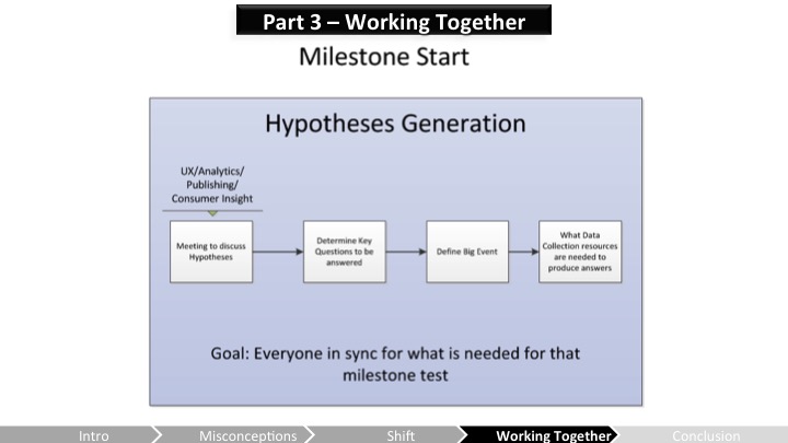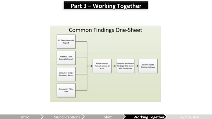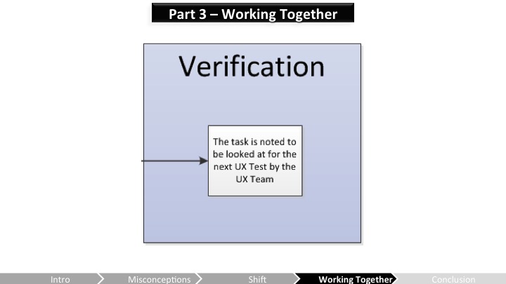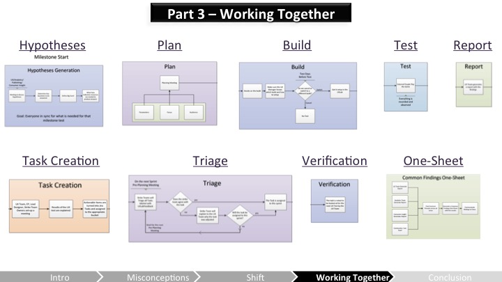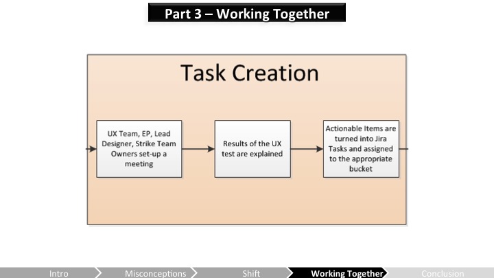 Heather – 우리는 통합되고 정의된 프로세스를 가지고 있지만 여전히 일이 필요해! 첫 번째 부분은 잘 작동하니까, 이제 우리는 긴급도 분류(triage)와 검증 단계를 개선하는데 초점을 맞춰야 해. 프로듀서들은 JIRA가 업데이트되고있게 해야 하고 팀은 활발히 UX이슈들을 붙들고있어야 해(그리고 그냥 다음 마일스톤으로 그것들은 마킹하고 넘기지 말고 말야). 만약 걸러지지 않고 적절히 조정되지 않는게 있다면, 그건 가시성을 잃게 돼. 두 팀 모두 UX피드백이 언제 구현될지를 더 잘 이해해야 재 테스트가 될 수 있어. 그건 재테스트를 하고 이슈가 해결되었다고 보이기 전까지는 제대로 고쳐지지 않아. UX의 높은 가시성을 확보하고 유지하기 위해서, 개발팀 인원들은 UX테스트를 관찰해야 할거야. 그리고 더 좋은걸 만들기 위해 워크플로우와 프로세스를 조정하는데 항상 열려있어야 해!