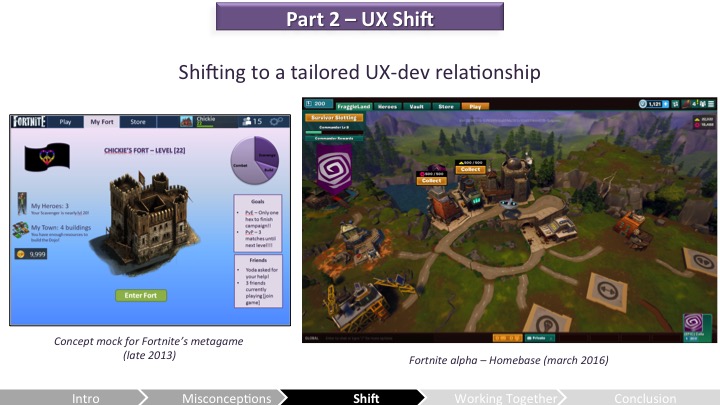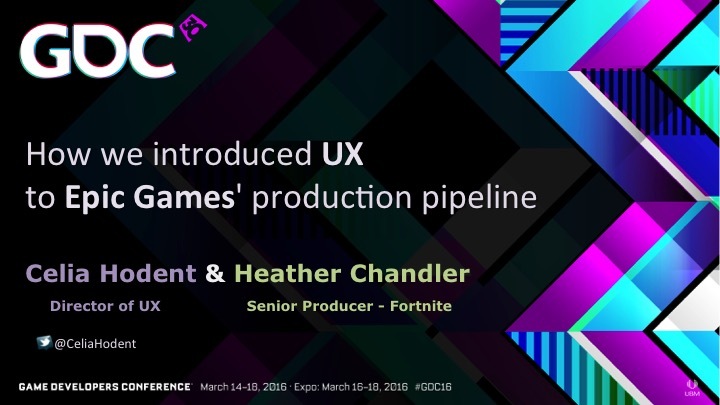 이 슬라이드들은 Fortnite (Epic Games)의 수석 프로듀서인 Heather Chandler와 함께한 내 GDC 2016 발표에서 나온 슬라이드들이야. 따라서 이번 발표는 UX 부서(Celia)와 프로덕션(Heather)의 관점에서 설명하고 있지. 이 프레젠테이션의 비디오를 여기서 볼 수 있어. 또한 UX에 관심이 있으시면 2016년 5월 12일에 열리는 Game UX Summit을 확인해보기 바라. (놀라운 라인업이 준비되어있다고! ^^)