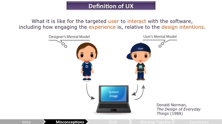 UX는 Human Factors와 HCI(Human-Computer Interaction; 인간과 컴퓨터 간의 상호작용을 연구하는 학문, 역자 주)뿌리를 두고 있어. 이는 누군가 설계한 것에 대해 별도의 가이드 없이 시스템을 유저가 이해하고 상호작용하는 방법을 살펴보게끔 해. 이로써 개발자의 멘탈 모델을 플레이어의 멘탈 모델과 일치시키게 해.(cf. Norman, 1988)