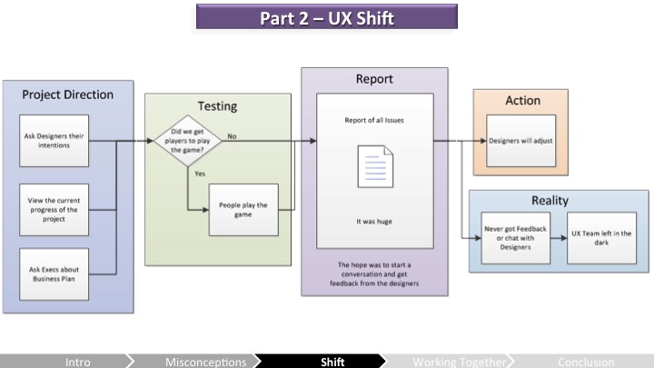 Heather – 새로운 프로세스/시스템을 개발 파이프라인에 억지로 밀어넣는 걸로 UX에 접근하는 대신, 우린 UX를 팀의 일원이라고 생각하기 시작했어. 우린 그들이 기획 의도를 알고 게임의 현재 부딪힌 문제에 따른 그들의 피드백을 조정할 수 있도록 팀의 일부분으로 느끼게 하려고 했지.