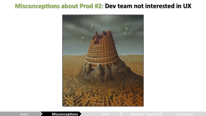 프로덕션 관점 (Heather) – 그러나 많은 팀들은 UX를 위협으로 보고 있어 – 요상한 외계인들이 침입하여 난장판을 만들고 있는 것처럼 말야. 왜 우리가 그들을 또 필요하다는거지? 우리는 그들 없이 잘 지내고 있었어.(적어도 우린 그렇게 생각했지.) 이것은 에픽에서 발생한 일이고, 이 토크의 목적은 개발과 UX 사이에서 더 나은 이해를 할 수 있도록 양쪽 관점을 모두 제공하는데 있어. 만약 우리가 서로를 이해한다면 우리는 그 관계에서 더 많은 것을 얻을거야. 이 관계의 시작은 험난했지. – UX 팀은 유용한 통찰력을 얻을 수 있기 위해 프로세스 초기에 많은 테스트를 실시하려고 밀어붙였지만 프로덕션 팀(제작진)은 더 큰 문제를 해결해야 한다고 생각했어. – 그들은 이미 UX 문제가 있다는 것을 알고 있었지만 나중에 해결할 계획이었지.