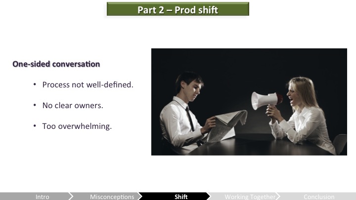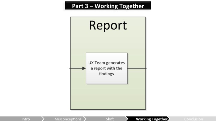 문제는 그들이 잘 모르는 팀의 일원으로부터 리포트가 보내졌다는 것, 그리고 UX에 관심이 있는 몇몇 기획자를 제외하면 나는 그 어떤 개발자와도 논의할 기회가 전혀 없었다는 거야. 그래서 결국, 개발팀은 이 전체의 것들에 대해 특별히 흥미로워하지도 않았고, 그 어떤 연결도 만들어지지 않았으며, 나는 개발팀의 플랜에 대한 전체 그림을 가지지 못했지.
