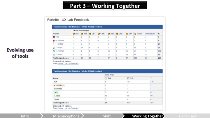 마지막으로, 게임에 있는 이슈들뿐만 아니라 개발팀이 지금까지 만들어오고 해결한 UX이슈의 모든 과정을 UX팀이 강조하는게 가장 중요해. 경영진은 뭔가 진행되고있는걸 보는걸 아주 좋아하니까(그리고 이슈가 지적될 때 그것들이 관리되고있다고 안심하기도 하고 말야). 개발팀은 우리가 얼마나 많이 진척되었는지를 알려주는걸 완전 좋아하고, 이렇게 모두가 행복해지지. 대부분의 경우 그렇다는... (게임 개발을 한다는건 결국 모두에게 힘들고 감정적인 노력이 드는 일이야.)