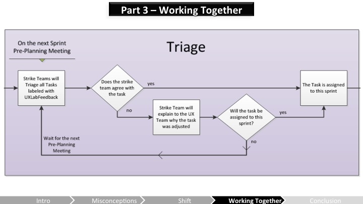 Heather – UX가 JIRA에 입력하고나면, 긴급도 분류 프로세스(triage process)가 개발팀에게 그것들을 검토하고 그 이슈가 다음 릴리즈에 해결할지, 미래의 릴리즈에 해결할지, 혹은 아예 안다뤄질지를 결정하는 방법이 돼. 만약 팀이 어떤 UX 피드백에 동의하지 않거나 우선순위를 바꾸고자 한다면, 그들은 그 옵션을 논의하기위해 UX 연구소와 미팅을 잡아야 해. 두 그룹이 합의하면, 그 작업은 개발 일정 안에서 적절하게 우선순위화 되지.