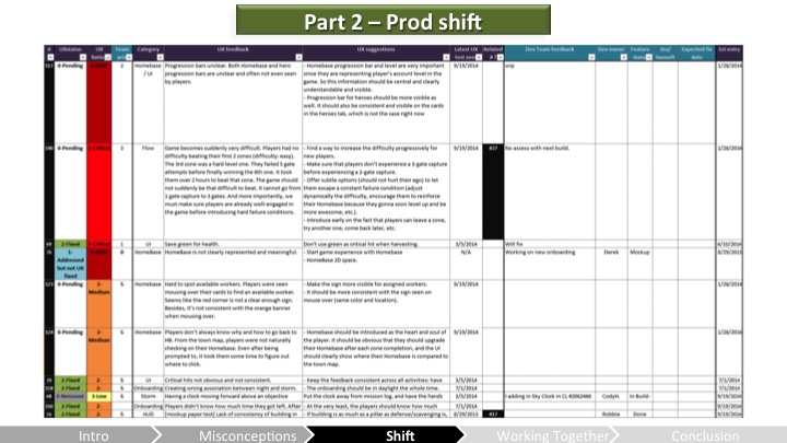 Heather – 내가 Celia와 일하기 시작했을 때, 그녀는 이 스프레드시트의 모든 UX 피드백을 추적했어. 그 당시, 이건 가장 효과적인 방법이었지. 보다시피 상당히 밀도가 빡빡해. 팀에게 주어진 UX피드백, 우선순위, 언제 구현되었는지, 그리고 혹시 재테스트가 되었는지를 추적해. 이 시트는 UX와 게임팀 간에 주 정보전달로써 사용되었는데, 개발자가 이 프로세스를 이끌거나 유지하지 않았기 때문에 주로 UX를 위한 도구였어.