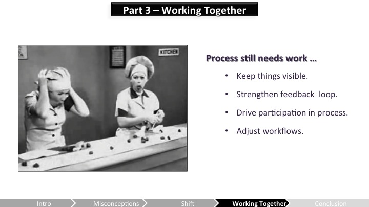 Heather – 강한 피드백과 구현 루프를 수립하고 두팀이 프로세스가 작동하는 방식에 대해 확실히 이해하게 하자. 필요에 따라 조정하고.