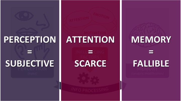 이 과정은 입력(예: 자습서 텍스트)에 대한 인식에서 시작되며, 우리가 우리의 많은 감각에 의해 전달되는 정보를 처리함에 따라(우리는 5개 이상의 것을 가지고 있다) 우리의 기억은 바뀔 가능성이 있다. 우리가 무언가를 배울 때, 새로운 시냅스, 즉 뉴런 사이의 연결이 생성되거나 강화된다. 우리의 뇌는 애당초 '강하게 배선되어있어서 재배선할 수 없는 것'이 아니기 때문에(because our brains are not hardwired in the first place), 당신이 인생에서 하는 모든 일들 - 책 읽기, 영화 보기, 친구들과 수다 떨기, 이 기사 읽기 등 -은 당신의 뇌 속에서 재연결된다. 뇌는 불안정하며, 이러한 가소성 덕분에 우리는 끊임없이 변화하는 환경에 적응할 수 있다. 자극에 대한 인식과 우리의 기억의 수정 사이에서 많은 일들이 일어난다. 특히, 학습의 질은 우리의 주의력, 동기, 감정과 같은 많은 요소들에 의해 영향을 받을 것이다.