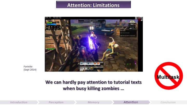 사람들이 정보를 처리할 때 얼마나 많은 주의를 기울이는가는 그 정보를 배우거나 유지하는데 있어 중요한 요소다. 주의를 기울일수록 주변에서 일어나고 있는 일을 처리하고 잘 간직하게 될 것이다. 인식, 기억, 주의 등 이러한 정신적 과정 각각에 대해, 우리의 주요 한계와 Fortnite의 개발 과정에서 이러한 한계를 어떻게 설명했는지 설명하겠다. 뇌는 극도로 복잡하다는 것을 명심하라. 우리는 도표와 같이 우리의 주변을 처리하는 독립적인 선형 채널을 가지고 있지 않다. 과정도 아니고. 컴퓨터는 설득력 있는 은유를 제공하지만 뇌는 컴퓨터처럼 작동하지 않기 때문에 우리는 뇌가 어떻게 작동하는지를 설명하기 위해 많은 용어를 사용한다. 이것은 훨씬 더 복잡하며, 과학자들은 이제 막 어떻게 작동하는지 이해하기 시작했다. 이 정신적 프로세스의 주요 한계점에 대해 짧게 설명하겠으나, 더 보고 싶다면 내 GDC 2015 토크를 참고하라.