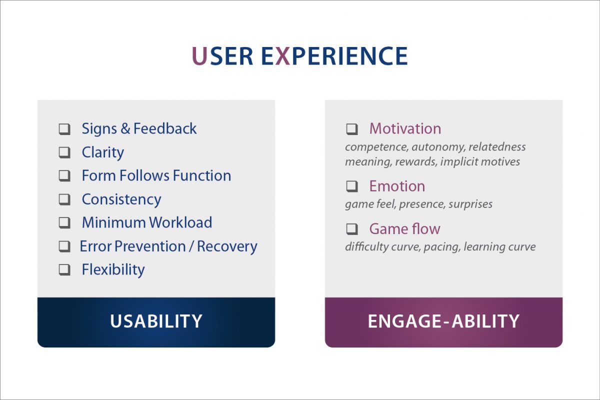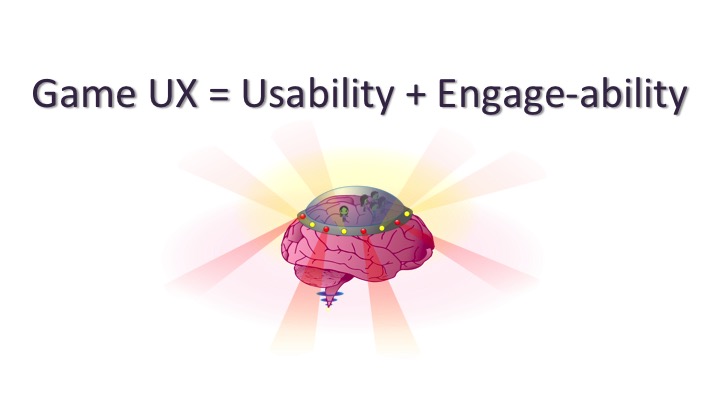 사용자 경험은 1990년대에 돈 노먼(애플의 전 부사장이자, The Design of Everyday Things(2013)의 저자) 이 제품, 시스템 또는 서비스에 대한 전체적인 경험을 설명하기 위해 만든 용어로서, 처음 들었을 때부터 구입하거나 다운로드했을 때, 그들이 그것과 상호작용할 때, 그리고 어떤 것에 대해 이야기했는지를 말한다. 그들은 나중에 그것에 대해 기억한다. 여기서는 플레이어가 게임과 상호작용을 할 때에만 집중할 것이다. 가장 매력적이고 재미있는 경험을 제공하는 한편, 플레이어가 디자인에 의해 가질 수 있는 모든 좌절감을 예측하기 위해, 우리는 게임에 두 개의 주요 UX 기둥을 사용한다. "사용성(Usability)", 그리고 내가 "사용가능성(Engage-ability)"이라고 부르는 것.