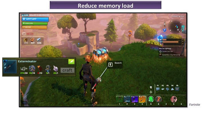 HUD는 플레이어가 어떤 총이나 능력을 갖추고 있는지, 얼마나 많은 탄약을 보유하고 있는지, 또는 다음 목표가 무엇인지와 같은 요소를 기억하는 것을 방지한다. Fortnite에서는 항목을 검색하기 위해 누를 키와 같은 많은 정보가 항상 표시된다. 플레이어는 이 정보를 기억할 필요가 없다; 그것은 항상 그들을 위해 UI에 나타난다. Another example is the option for players to pin a recipe they are interested in crafting in their HUD. 또 다른 예는 플레이어가 그들의 HUD 상에 조합하고자 하는 레시피를 고정하는 옵션이다. 그들은 그들이 어떤 재료를 수확해야 하는지 기억할 필요가 없다; 그들은 단지 그들의 목표에 집중할 수 있다. 우리의 기억은 틀릴 수 있다. 게임으로 돌아와서 제어, 목표 또는 특정 시스템이 어떻게 작동하는지 기억하지 못하는 것은 때때로 매우 좌절할 수 있다. 따라서 플레이어의 메모리 로드를 조절하는 것은 그들이 재미를 위해 중요한 정보를 기억하지 못하기 때문에 게임을 그만두지 않도록 하는 데 중요하다.