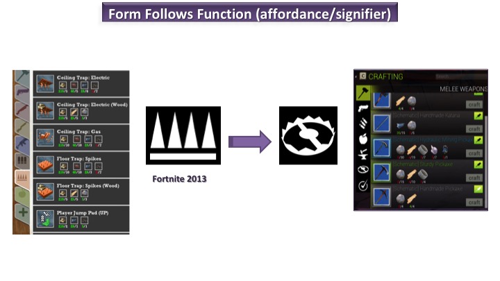 만약 당신이 이러한 휴리스틱스에 더 깊이 빠져들고 싶다면, 나는 당신이 나의 GDC Europe 2014 토크을 읽어보길 바란다. 이러한 휴리스틱스의 목표는 게임이 최대한 직관적이고 사용하기 쉽도록 하는 것이다. 우리는 메뉴 탐색의 어려움, 직관적이지 않은 아이콘 또는 시스템을 혼란스럽게 하는 것과 같이 설계에 의해서가 아닐 수 있는 모든 좌절감을 제거하기 위해 노력한다. 게임의 모든 자극("신호 및 피드백"이라고 함)은 의도한 대로 명확하고 일관적이며 인식되어야 한다. 우리는 인지 부하(예: 기억력 및 주의력 부하)와 물리적 부하(예: 동작을 수행하기 위한 클릭 수)를 최소화하는 것을 목표로 한다. 우리는 또한 플레이어가 좌절감을 주는 오류를 경험하지 않도록 하고, 이러한 오류가 플레이어에 도전하지 않을 때 플레이어가 그것들로부터 쉽게 회복할 수 있도록 노력한다. 예를 들어, Fortnite에서는 전투, 수확, 조합, 건설을 관리하면서 살아남기 위한 전략을 개발하는 데 참가자들에게 도전하기를 원한다. 그러나 우리는 그들이 아이템을 어떻게 갖추어야 하는지 또는 무기를 만드는 방법을 찾는데 도전하기를 원하지 않는다. 마지막으로, 우리는 모든 사람이 게임을 할 수 있도록 제어장치, 자막, 색맹 모드 등의 다양한 옵션을 제공하려고 한다. Fortnite의 개발 내내, 우리는 게임의 사용성을 개선하고 폴리싱하기 위해 수많은 UX 테스트를 수행했다.
