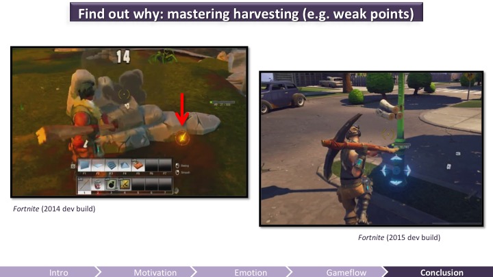 예를 들어, 포츠나이트의 초기, 폐쇄된 알파 온라인 테스트 동안, 몇몇 플레이어들은 게임이 너무 "그린디(믹서기 소리같이 짜증나는)"하다고 불평했다. 그들은 레벨업을 하는동안 더 많은 고급 물건들을 만드는 데 필요한 재료들을 수확하는 데 너무 오랜 시간이 걸린다고 느꼈다. 이 문제가 어디서 발생한거지? 그 게임은 디자인에 문제가 있었나? 시스템 설계자들은 그들의 수학을 검증했고 수확과 조합 시스템이 정확히 균형을 이루었다고 결론지었다. 그렇다면 왜 선수들은 불평했을까? 이 문제는 왜 이런 일이 일어났는지를 알아보기 위해 오랜 조사를 시작했다. 설계에서 비롯된 것이 아니라면, 참가자들의 (주체적) 인식에서 비롯될 수 있다는 가설이었다. 따라서 많은 요소들이 조사되었다. 그 중 하나가 "약점 시스템"이라고 불리는 기능의 UI(사용자 인터페이스)였다. Fortnite에서는 플레이어가 세계에서 물체를 수확할 때(예를 들어 바위 더미) 약점이 나타나 선수들이 그것을 겨냥하도록 격려한다. 그들이 그 물체를 샅샅이 뒤지면서, 선수들이 그것의 약점을 목표로 한다면, 그들은 그것을 훨씬 더 빨리 파괴한다. 문제는 초기 UX 테스트에서 선수들이 이러한 약점들을 완전히 무시하고 있는 것을 관찰하고 있다는 것이었다. 이 문제는 사소한 것으로 볼 수 있지만, 전체 수확 체계가 약점을 이용한 선수들에 기초했기 때문에 잠재적으로 파급 효과에 비교적 큰 영향을 미쳤다. 따라서, 만약 그들이 그것을 사용하지 않는다면, 그들은 어떤 것을 수확하기 위해 고안된 것보다 훨씬 더 오래 걸리고, 이것은 분명히 수확 속도에 대한 그들의 인식에 영향을 미칠 수 있다. 이것이 그 팀이 이 작은 UI 요소를 많이 반복한 이유다. 첫째, 선수들이 처음에 그것이 그곳에 있다는 것을 깨닫지 못했기 때문에, 그것은 더 크고 더 명백하게 만들어졌다. 일단 그것이 더 눈에 띄자, 선수들은 그것을 발견하고는 그들이 현재 어떤 아이템을 목표로 하고 있는지를 알려주는 신호라고 생각했다. 결국 설계자는 "Save the World"(플레이어 대 환경 모드)의 초기 경험에서 약점을 제거하여 플레이어가 스킬 트리에서 이를 잠금 해제해야 했다. 따라서 그것은 더 많은 팡파르로 의미있는 보상이 되었고, 전반적으로 그것은 속임수를 썼다. 대다수의 선수들이 이 변화 이후 마침내 약점이 제대로 들어맞았다. 적어도 "Save the World" 모드에서는...