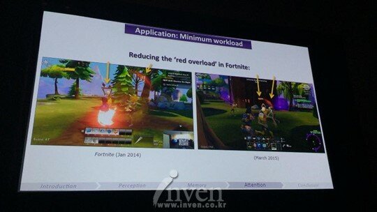 “'빨간색 과부하(Red Overload)’라는 문제가 있습니다. 아래는 언리얼 토너먼트3의 화면입니다. 보통 빨간 색은 유저들에게 어떤 경고를 하거나 중요한 정보를 전달하는데 유용한 색입니다. 하지만, 언리얼 토너먼트처럼 팀을 구분하는 색깔, 타격시 방향 표시, 체력바, 현재 사용 무기 등 대부분 중요한 UI가 빨간 색인 상황에서는 유저들은 어떤 것에 집중해야할지 판단하기가 힘듭니다. 실제로 통계를 보면 언리얼 토너먼트3에서 파란 팀이 빨간 팀보다 전체 승률이 5% 정도 앞섰습니다. 그래서 포트나이트에서는 빨간색 과부하를 줄이고, 중요한 정보를 빨간 색이 아닌 오렌지색이나 녹색으로 표시했더니 유저들의 집중도가 향상되는 결과를 볼 수 있었습니다."