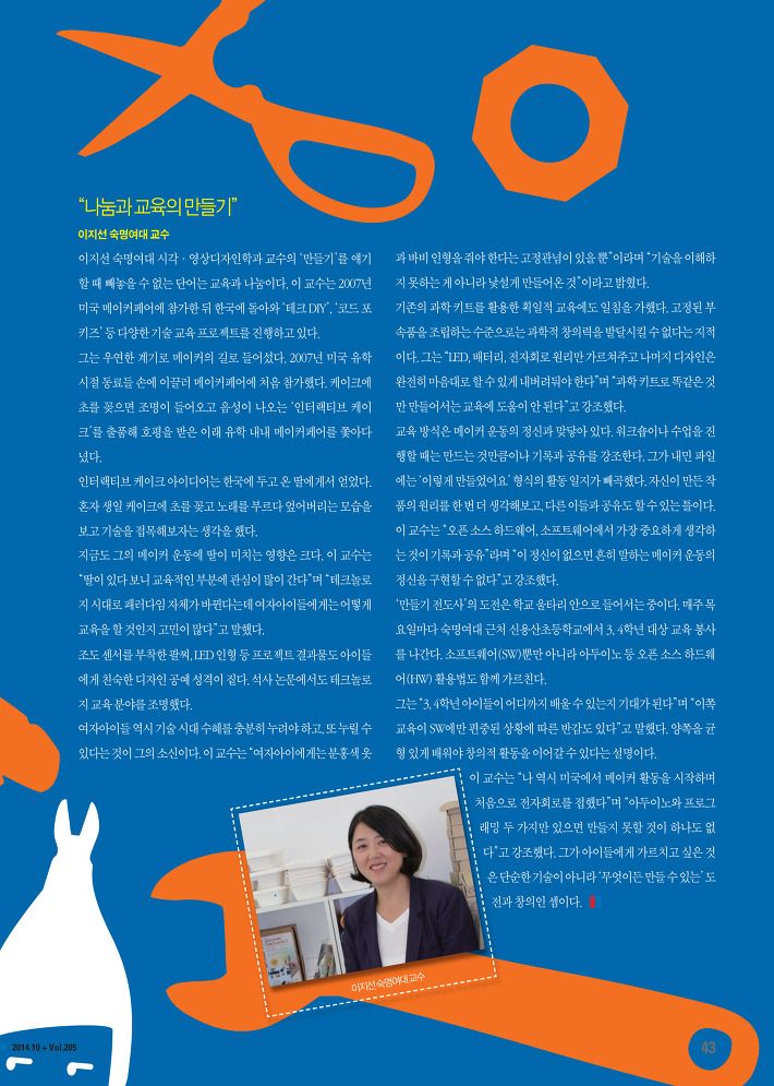 보고 기술을 접목해보자는 생각을 했다. 지금도 그의 메이커 운동에 딸이 미치는 영향은 크다. 이 교수는 “딸이 있다 보니 교육적인 부분에 관심이 많이 간다”며 “테크놀로지 시대로 패러다임 자체가 바뀐다는데 여자아이들에게는 어떻게 교육을 할 것인지 고민이 많다”고 말했다. 조도 센서를 부착한 팔찌, LED 인형 등 프로젝트 결과물도 아이들에게 친숙한 디자인 공예 성격이 짙다. 석사 논문에서도 테크놀로지 교육 분야를 조명했다.