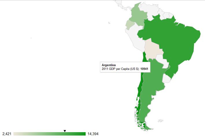 국가, 국토, 도시, 등에 대한 자료 상황을 설명하는 것에 좋은 방법은 지도를 사용하는 것에 있다. 예와 마찬가지로, 우리는 지도에서 몇몇의 남미 국가의 per capita GDP를 표시하는 것에 Google에 의한 토지 도표 시각화 도구를 사용할 것이다. 이 단계를 따르라: