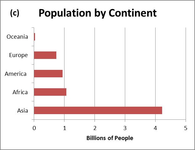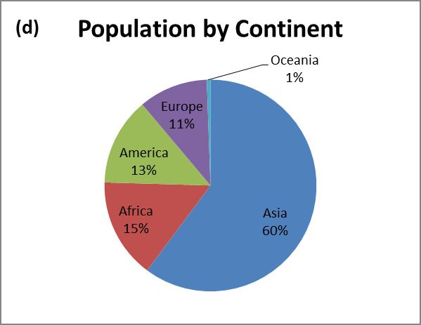 5. 자료를 표시하는 것에 가끔 다양한 방법이 있고, “최선”의 방법은 가끔 어떠한 주어지는 데이터셋에 대한 의견의 문제를 제시하는 것이다. 대륙 인구에 대한 자료의 두 가지 추가적 디스플레이를 고려하라, 막대도표(c)와 파이차트(d).
