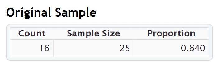 a) 웹 applets StatKey를 열어라. 그리고, ‘무작위화 가설 시험Randomization Hypothesis Tests’ 아래 applet ‘단 하나의 비율을 위한 시험Test for a Single Proportion’을 열어라. 연구 위쪽으로부터 자료가 스크린의 오른쪽에 나타날 수 있다. 바르게 선택한 비율이 16/25 = 0.640 였던 사람을 기록하라.