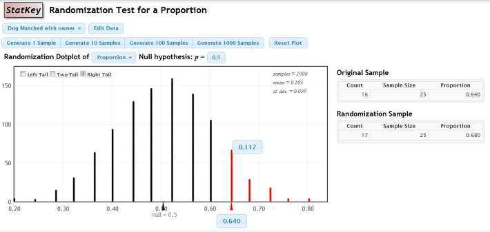 c) 실재 결과가 얼마나 가망 없는지를 결정하기 위하여, 우리는 무작위 추측 아래에 많은 가능한 데이트 셋을 가장하는 것이 필요하다. ‘1000개 사례 산출하기’를 클릭하는 것으로부터 이것을 하라. 이러한 가장된 데이터 셋의 각각에서 바르게 추측한 사람의 비율은 도표에서 보여주는 작은 점과 같이 주어진다(그러므로 1000개의 작은 점이 있다). 0.640 또는 더 많은 비율에서 결과된 이러한 자료집합의 많은 것이 얼마나 바르게 추측하는지를 결정하는 것에, 잘려-나간 수와 같은 0.640에 들어간 수평 축 아래 파란 상자에서, 도표의 꼭대기에 ‘오른쪽 꼬리’를 대조하라. 0.640이거나 더 많은 것의 비율에서 결과된 1000개의 가상의 비율은 파랑 상자 위쪽에서 주어진다.