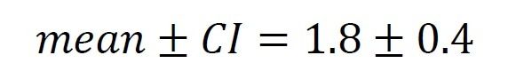 6. Rosling은 5가지 문제로 이루어진 하나의 퀴즈를 수업에 주고, 이 학생들이 1.8점의 옳은 문제에 대한 평균을 얻는다. 만약 Rosling이 이 수업에서 학생의 다른 한 조에게 같은 퀴즈를 준다면, 그들의 평균 점수가 다시 정확하게 1.8점이 될 가망은 없다. 약간 더 높거나 약간 더 낮을 수 있다. 우리는 자료에서의 변이성이 있는 민감한 결과를 어떻게 측정할지에 신뢰구간(CI)을 사용할 수 있다. 표시는